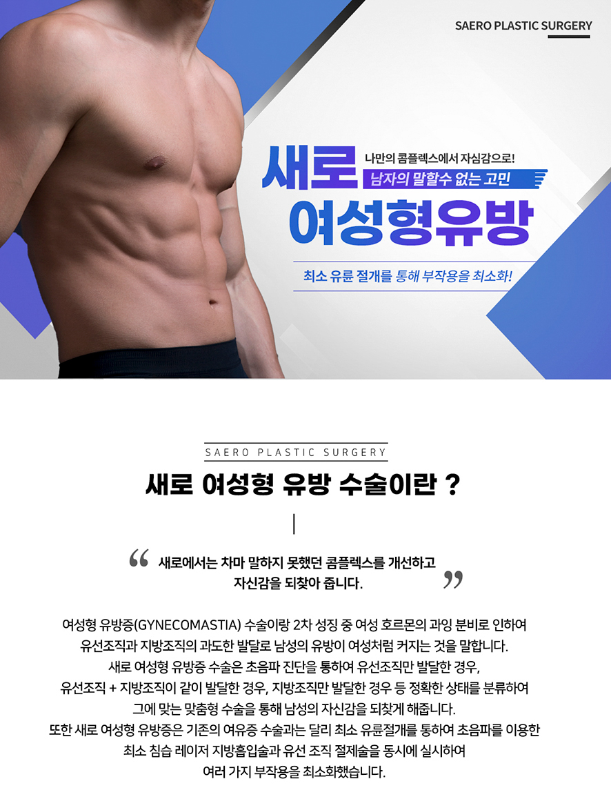 안녕하세요. 새로성형외과입니다. 최근 건강에 대해 관심을 가지고 다이어트나 운동, 식단조절을 통해 자신이 원하는 몸매를 만드시는 분들이 많아지고 있습니다. 그중에서도 자신이 원하는 부위에 만족이 안된다면 수술이나 시술을 통해 자신이 원하는 방향으로 몸을 만들기도 합니다. 하지만 반대로 빠지지 않는 부위로 인해 고민이 있으신 분들도 계실텐데요. 그중에서도 남성분들 중 여성의 가슴처럼 튀어나온 가슴으로 인해 스트레스를 받으시는 분들은 여성형 유방증을 고민해볼 수 있습니다. 이러한 가슴으로 인해 셔츠를 여러겹 입고 남의 시선을 피하기 위해 등을 구부리는 것에 대한 불편함으로 고민이신 분들은 새로성형외과로 오세요!