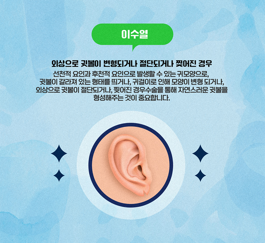 이수열은 외상으로 귓볼이 변형되거나 절단되거나 찢어진 경우를 말합니다. 이수열은 선천적 요인과 후천적 요인으로 발생할 수 있는 귀 모양으로 귓볼이 갈라져 있는 형태를 띄거나, 귀걸이로 인해 모양이 변형되거나, 외상으로 귓볼이 절단되거나 찢어진 경우 수술을 통해 자연스러운 귓볼을 형성해주는 것이 중요합니다. 최근에는 피어싱, 귀걸이로 인해 귓볼이 찢어지는 사고가 많이 발생하기 때문에 본래의 모습으로 재건하시고 싶다면 귀성형을 받으세요. 수술경험이 많고 노하우가 풍부한 성형외과 전문의가 흉터, 부작용 없이 수술을 진행합니다.
