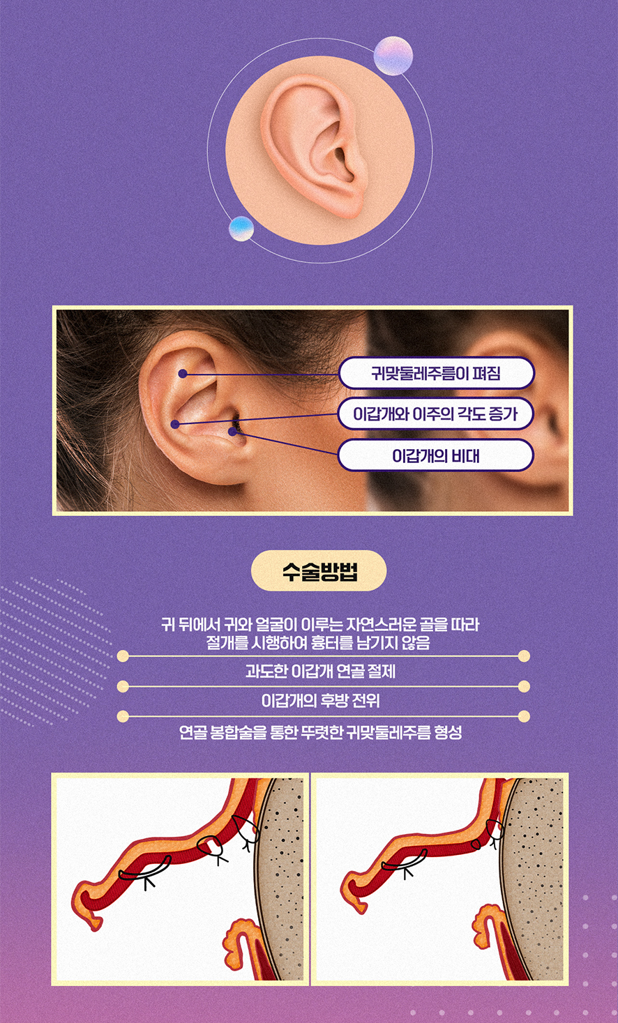 - 연골 봉합술을 통한 뚜렷한 귀맞둘레주름 형성