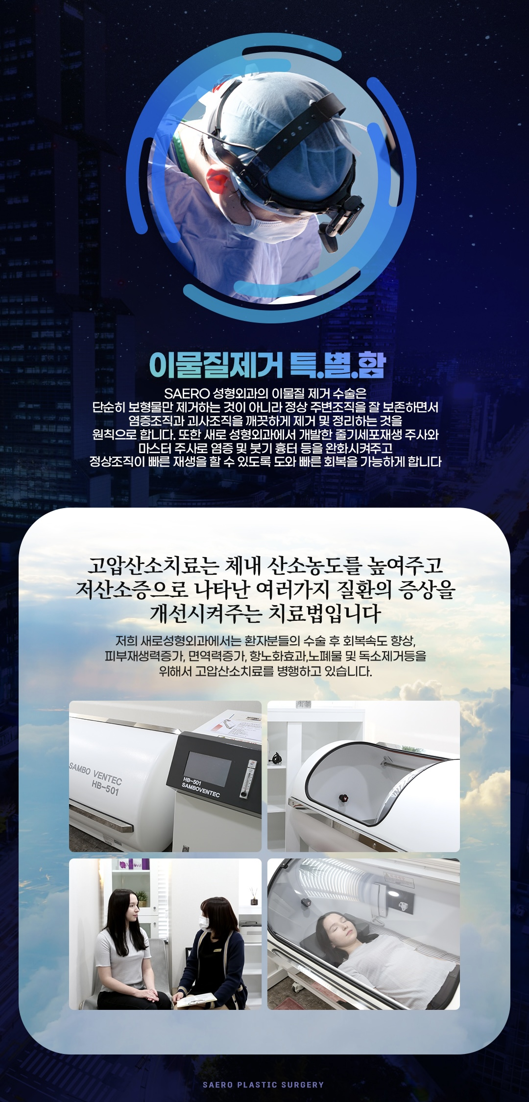 새로성형외과는 이물질제거 수술 후 피부처짐까지 생각하며 리프팅과 동시에 재생관리 및 안전사후관리까지 한번에 받을 수 있는 올인원 시스템을 운영하고 있습니다.