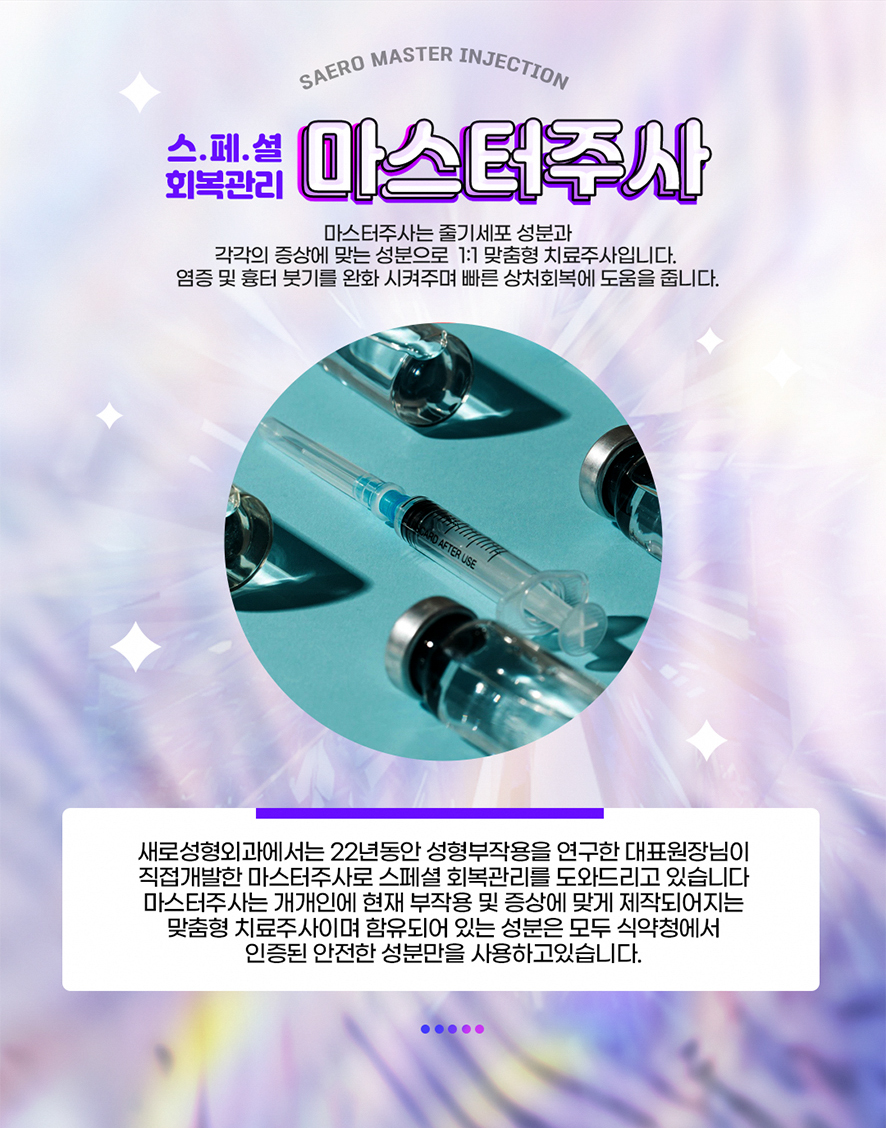 새로성형외과에서는 고압산소치료와 마스터주사로 회복관리를 도와드리고 있습니다. 고압산소치료는 체내 산소농도를 높여주고 저산소증으로 나타난 여러가지 질환의 증상을 개선시켜줍니다. 환자분들의 수술 후 회복속도 향상, 피부재생력증가, 면역력증가, 항노화효과, 노폐물 및 독소제거등을 위해 고압산소치료를 병행합니다. 마스터주사는 22년동안 성형부작용을 연구한 대표원장님이 직접 개발한 주사로 염증 및 흉터, 붓기를 완화시켜줍니다. 수술 후 부작용이나 붓기 등에 대한 걱정이 있으셨던 분들께서는 걱정 덜으시고 내원해주시면 감사하겠습니다.
