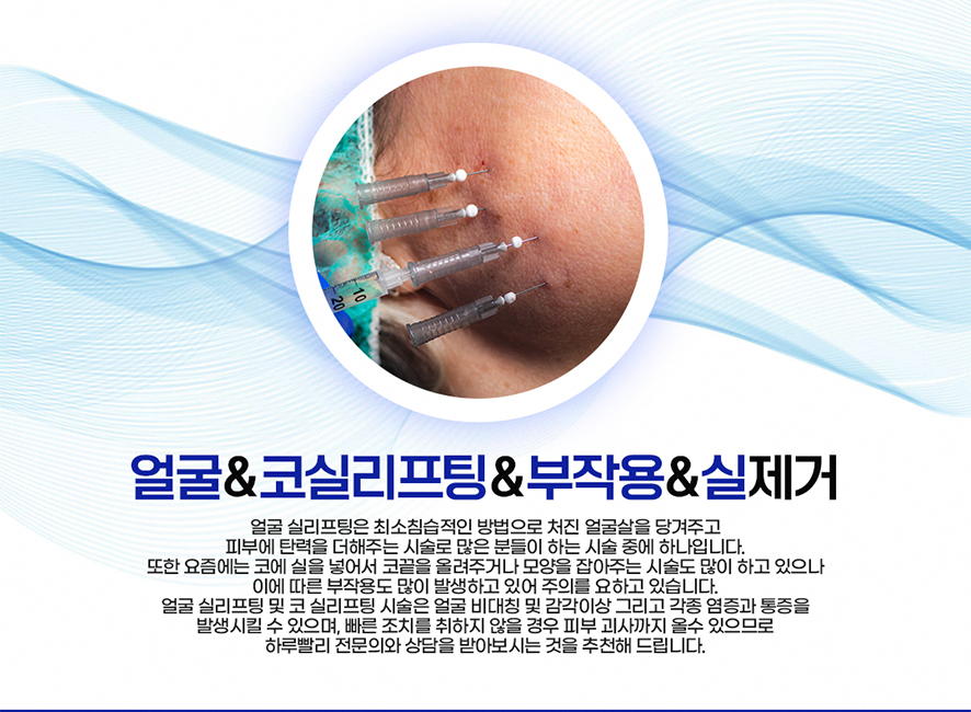 얼굴 실리프팅은 최소침습적인 방법으로 처진 얼굴살을 당겨주고 피부에 탄력을 더해주는 시술로 많은 분들이 하는 시술 중 하나입니다. 또한 요즘에는 코에 실을 넣어서 코끝을 올려주거나 모양을 잡아주는 시술도 많이 하고 있으나 이에 따른 부작용도 많이 발생하고 있어 주의를 요하고 있습니다. 얼굴 실리프팅 및 코 실리프팅 시술은 얼굴 비대칭 및 감각이상 그리고 각종 염증과 통증을 발생시킬 수 있으며 빠른 조치를 취하지 않을 경우 피부 괴사까지 올 수 있으므로 하루 빨리 전문의와 상담을 받아보시는 것을 추천해드립니다.
